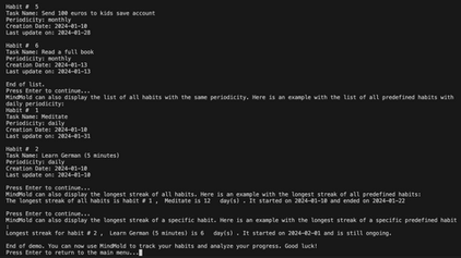The result of this work is an application called MindMold, a user-friendly command-line interface (CLI) application designed to help individuals cultivate and maintain beneficial habits. It simplifies the process of habit tracking, enabling users to create, monitor, and analyse their habits over time. With MindMold, users can easily manage their daily routines and work towards achieving their personal growth goals.